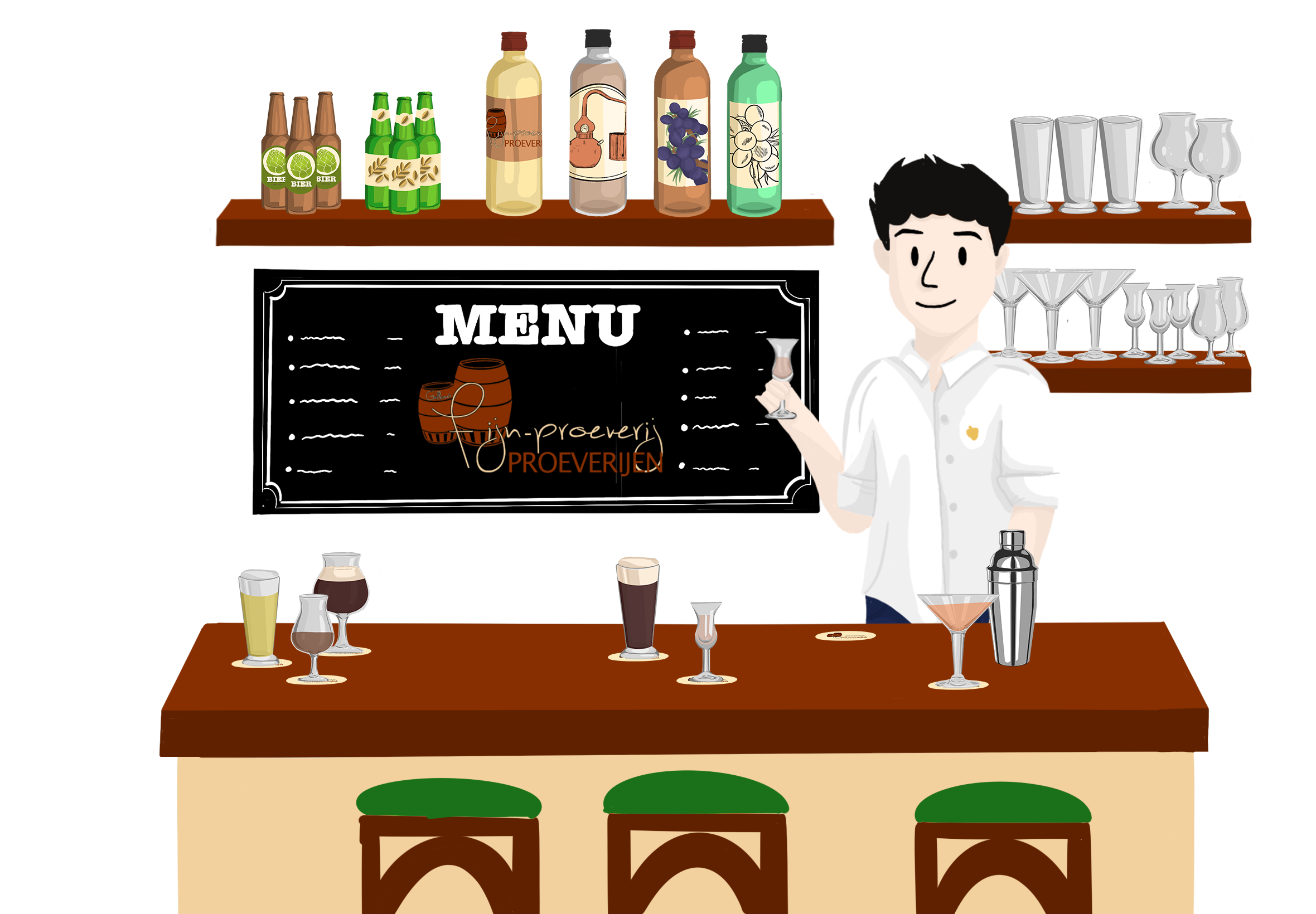 Fijnproeverij already had a corporate identity, and their posters feature a dark background, which is something important to consider in the sketching phase of an illustration. There were already some existing illustrations, so I wanted to keep the same style while also making it my own. The illustration includes various elements: a character, glasses filled with different drinks, and bottles with labels. I took the time to illustrate each element separately and then combined them into one illustration. This approach allowed me to easily adjust the composition.